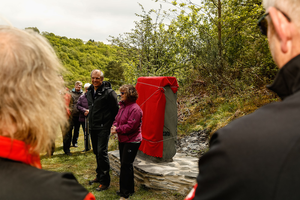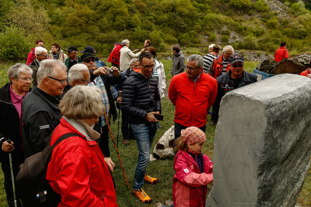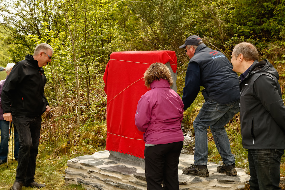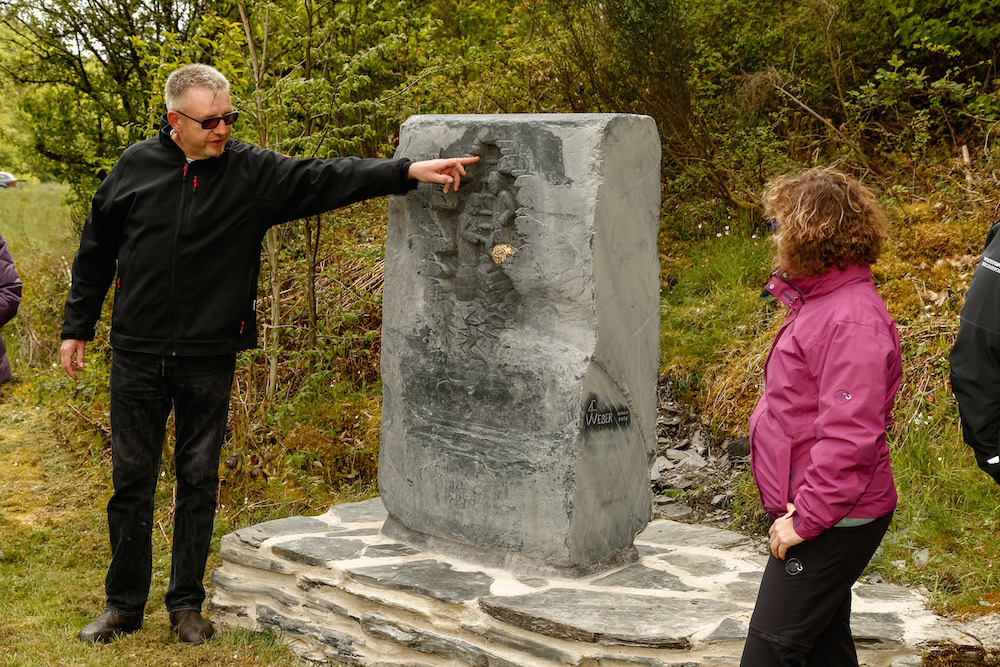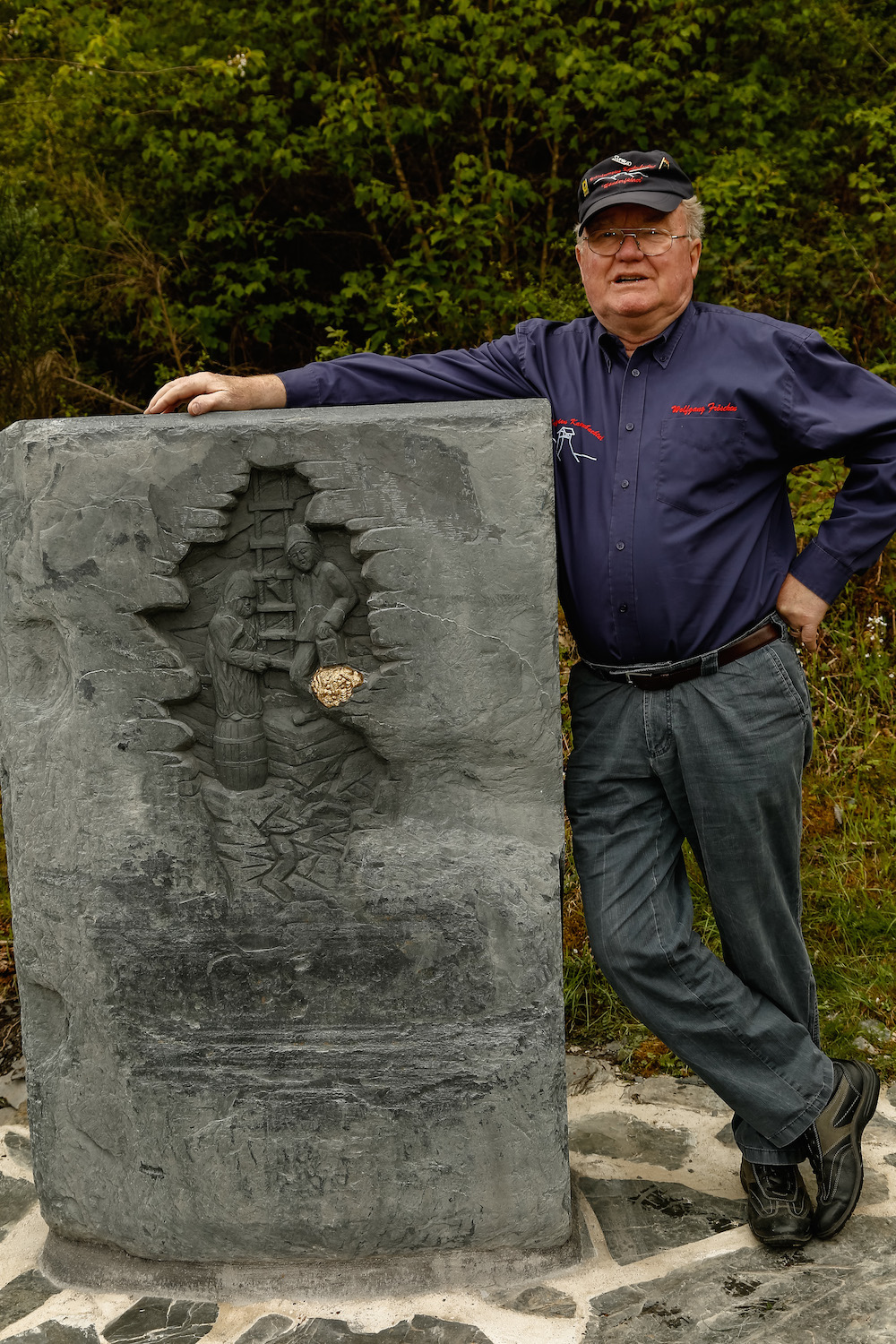 Sponsoring der Firma Brillen-Müller ermöglicht die Aufstellung einer Steinmetzarbeit mit dem sagenumwobenen Kaulenmännchen am Schiefergrubenwanderweg im Kaulenbachtal. Steinmetz und Bildhauer Friedhelm Weber aus Ulmen entwirft ansprechendes Motiv.